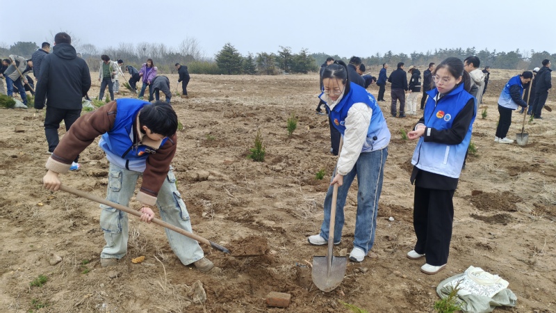 植树活动现场,在西海岸新区环海林场工作人员指导下,校区师生志愿者三人一组、分工协作。参与植树的师生相互配合,挥锹铲土、培土围堰、提水灌溉,衔接有序,植树过程中参与师生热情高涨、干劲十足,现场一派热火朝天的劳动场景。经过辛勤劳动,栽植雪松300余棵,一棵棵新栽种的树苗迎风挺立,在和煦的春风中展现出蓬勃生机。