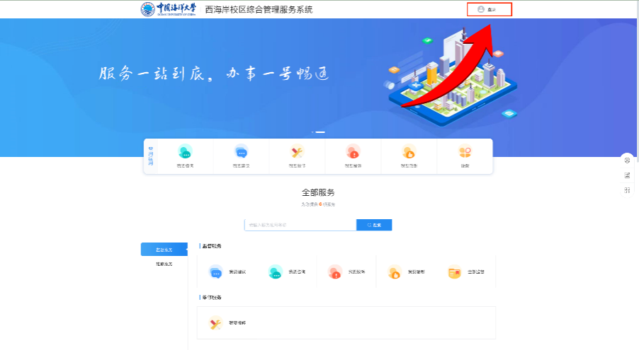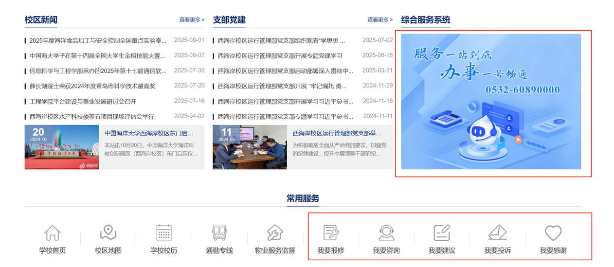 2.登录西海岸校区运行管理部网站https://xhaxqyg.ouc.edu.cn/main.htm点击综合服务系统图片或在常用服务栏目选择各单项服务。
