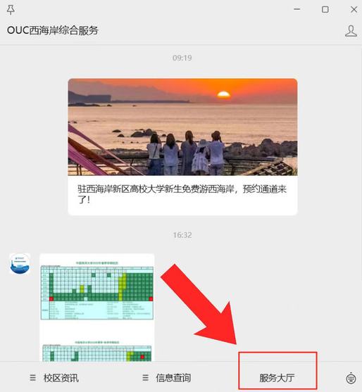 4.通过微信公众号“OUC西海岸综合服务”,在菜单栏点击右下方的按钮“服务大厅”,可以更加便捷地使用“西海岸校区综合管理服务系统” 。