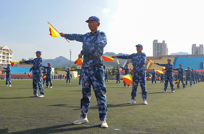 本次军训总结汇报会在庄严的国歌声中拉开帷幕。首先进行的是军训科目演练,军体拳、队列动作、海军旗语、战术动作,同学们整齐划一、气势恢宏、精彩纷呈的演练,赢得现场阵阵掌声。随后,在《中国人民解放军进行曲》雄壮激昂的旋律中,军训分列式正式开始,各方队英姿飒爽、步履坚定,充分展示了本次军训获得的丰硕成果,彰显出新一代海大学子青春昂扬的精神风貌。