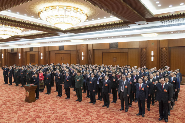 新当选的第十三届全国人民代表大会常务委员会委员进行宪法宣誓(来源:中国政府网) 本站讯