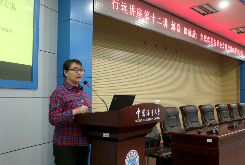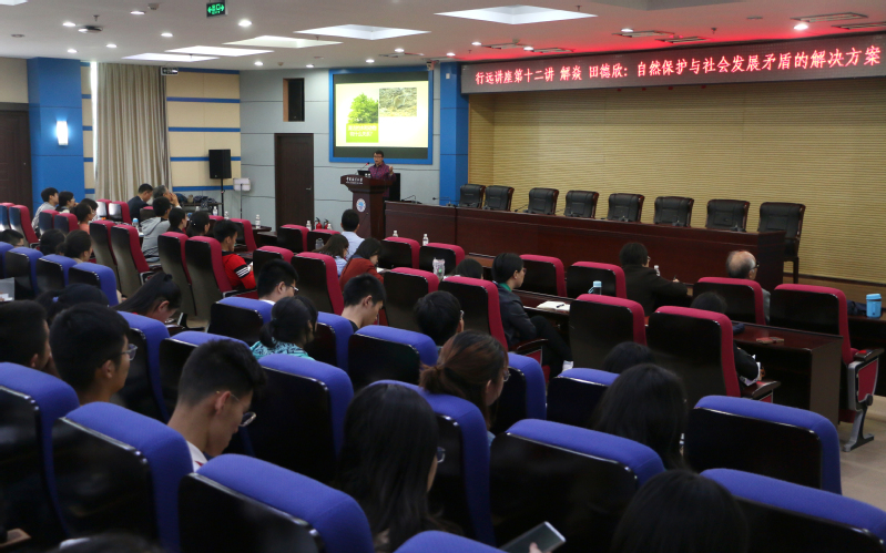 在随后的报告中,田德欣老师从时间维度和空间维度上阐释了保护生态多样性的重要性。他指出:从全球来看,保护生物多样性存在诸多不确定因素,我们应该从人类自身出发,明确人与生态系统、与生物多样性的关系。谈到满足人类生存需要与自然保护地关系的问题,田德欣老师说,应该将人类的生存需求进行量化,在足够的保护地之外适度开发,就能有效缓解保护与发展的矛盾。“如果30年之后生态系统的情况不比今天差,就是很大的成果。”