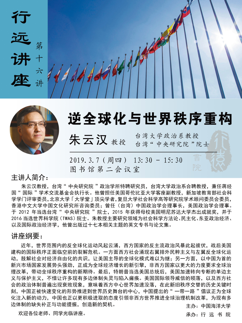 行远讲座第十六讲通知——朱云汉:逆全球化与世界秩序重构