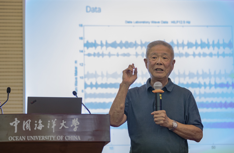 讲座伊始,黄锷院士提到他目前所做的工作,没有一件不是受海洋启发而获得的。他从海浪的成长过程谈到海浪与湍流的交汇作用,向在场师生展示了近二十年来的研究成果。在过去对波浪的研究中,他发现一直以来被广泛采用的傅里叶分析方法存在偏差:谱峰下移时并不意味着能量的下移;对于海浪这种非线性的、非稳定的自然现象不能简单平均预判和分析。黄院士因此发展出一套非线性和非稳定的数据分析工具,并能够用于研究很多其他的现象。