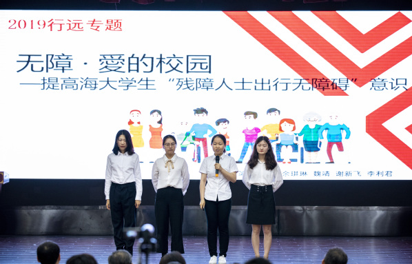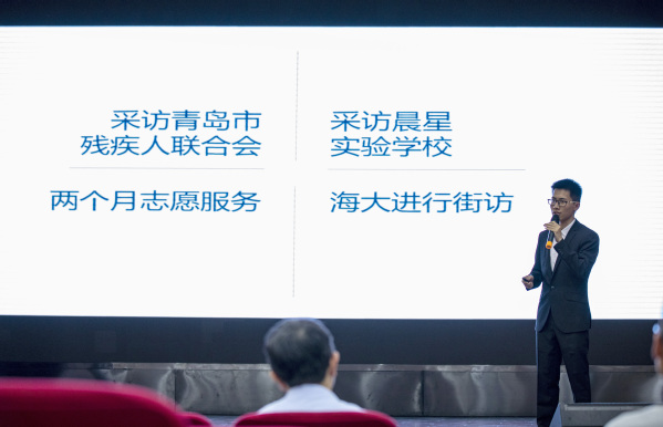 紧接着第一组带来了关于探索无障碍校园的主题报告。基于与残障人士的交流、访谈他们的出行需求以及对海大校园无障碍设施的调研结果,小组成员认为无障碍意识的匮乏是导致残障人士出行障碍的主要原因。为此,小组成员针对提高同学们的无障碍意识开展了线上文章宣传,线下“残疾人生活体验日”和“我们可以为无障碍校园做什么”沙龙分享会,与同学们互动,让更多的同学切身体验无障碍环境的必要性,让“无障碍”的呼吁变得更加鲜活且真实,增进了大家对残障人士出行需求的关注度。