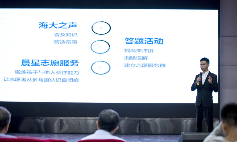 下半场首先上场的第八小组以“自闭症儿童”为主题,首先向观众们讲解了我国自闭症儿童的现况,以及大学生对自闭症儿童存在的一些误解,让“星星的孩子”这一独特的群体点亮了大家心中的蓝灯。面对“自闭症儿童”这一社会难题,该组同学通过举办“点亮蓝灯,关爱自闭症儿童”的主题日活动,联系海大之声广播站播放相关音频文章,组织志愿服务队伍前往晨星实验学校开展志愿服务等活动让更多人消除对自闭症儿童的误解,关注、关怀并接纳自闭症儿童。