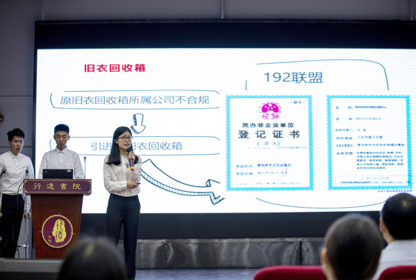随后行远专题第二小组就改善海大校内旧衣回收情况进行了报告。在我国旧衣回收率低这一背景下,小组成员经调研发现海大同学旧衣回收意识不足,校内旧衣回收箱也处于不合规的运营状态中。在此调研基础上,该小组一方面通过举办“旧衣回收知多少答题闯关活动”、发布微信推文等方式为提高同学们的旧衣回收意识做出努力,号召同学参与旧衣回收。另一方面通过重新引进合格的旧衣回收箱、举办旧衣回收APP体验活动等,试图为同学们提供多元的旧衣回收途径,为推动校内旧衣回收做出了初步尝试。
