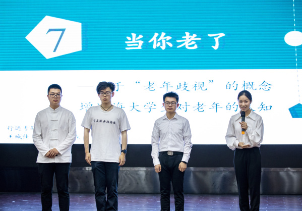 首先上场的是行远专题第七组,小组成员发表了题为“当你老了——基于‘老年歧视’的概念增进海大学生对老年的认知”的报告。他们阐述了“老年歧视”的概念,并提出基于对海大学生的深度访谈和问卷调查所得到的“部分海大学生存在老年歧视”这一结论。为解决这一问题,他们通过制作、推广动画视频普及老年歧视概念;通过举办线下观影会、分享会,展示小组自己拍摄的纪录片《不一样的老年人》,并就相关问题组织讨论,以破除学生对老年群体的刻板印象,丰富其对老年人的认知。