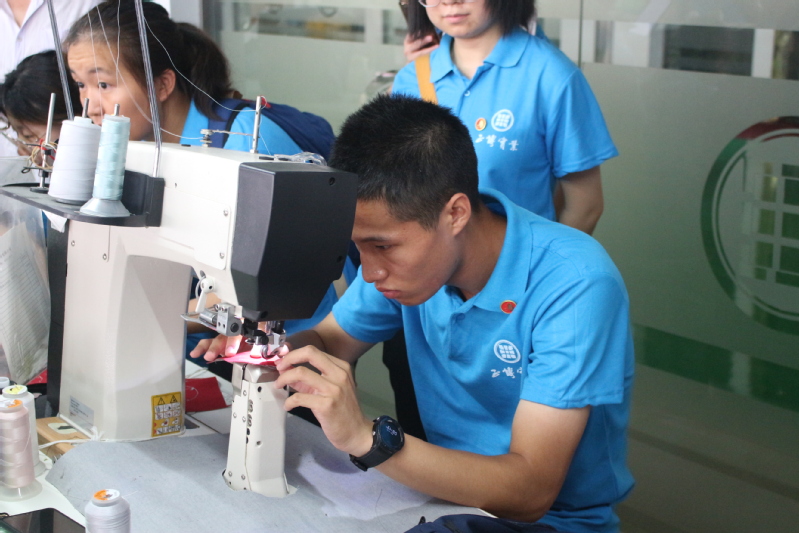 在工厂的实践中,同学们分为三个小组交叉进行生产体验。从研发设计到原材料仓库的检验,再到布料的裁断、针车的拼接、鞋底的粘合、装箱和产品质量的检验,全环节体验中既有带队老师的讲解,亦有各步骤的亲身操作,每个小组都完整地体验了流水线生产过程。在体验学习之后,每位同学选择了一个与企业运营或工厂运作相关的课题,进一步作调研探究,在企业节能、战略构思、品牌构思等企业运行的各个方面进行更深一步的认知和思考。