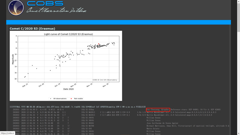 12月5日清晨,行远书院五期生郭辰洋在开云电竞网址崂山校区(36.164°N, 120.507°E)利用一架小型天文望远镜(型号:Celestron C90 MAK)对即将达到近日点的彗星Erasmus(C/2020 S3)进行观测,并将观测记录上报国际知名彗星观测网站COBS(cobs.si),预估彗星当前亮度6.4等。COBS审核郭辰洋同学提供的信息并发布在Recent Comet Brightness Estimates版块中。