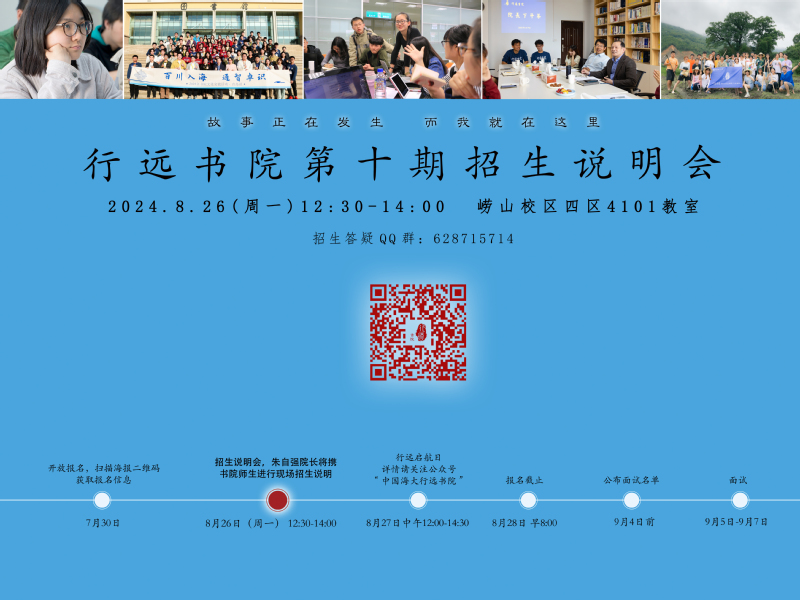 行远书院第十期招生报名正在进行中,为使新生充分了解行远书院,书院拟定于826日举办招生说明会,现将说明会详情通知如下: