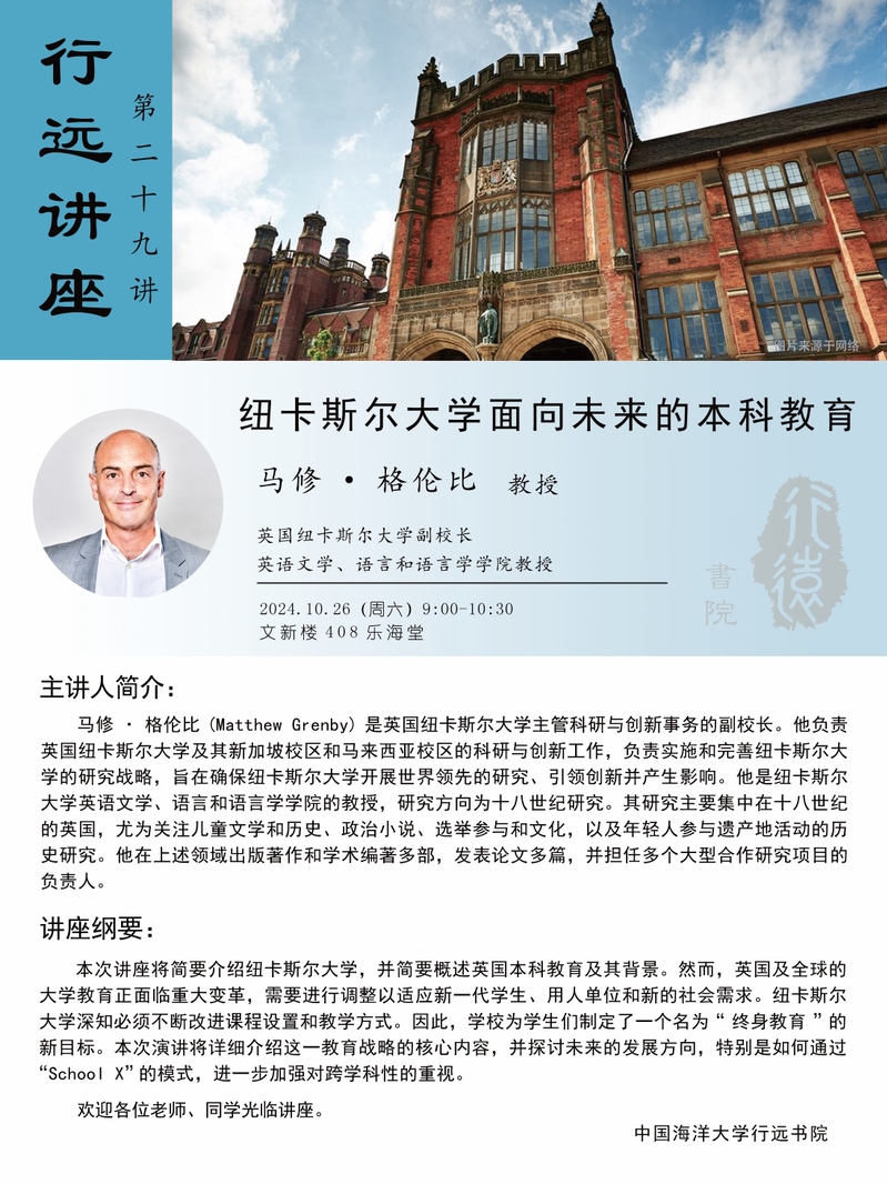 行远讲座第二十九讲通知——马修·格伦比:纽卡斯尔大学面向未来的本科教育
