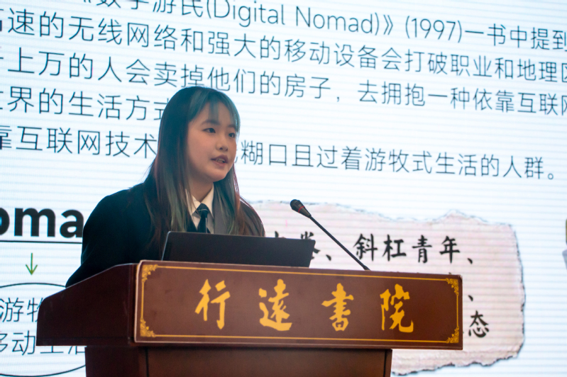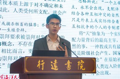 在学生主旨报告环节,行远书院九期生李天首先以《“天”观念的商周之变》为题进行报告。他以考古及被证实的历史文字资料为依据,阐述了商周时期“天”观念的嬗变过程,分析了周人道德化“天”与人的交互途径这一理论创新对实现中国政治的理性化和构建多民族国家的基本认同产生的影响。八期生祝祯以《嵌入性视角下数字游民助力乡村振兴的研究》为题作报告。她聚焦现代社会中的数字游民,引入嵌入理论,以国内数字游民发展高地浙江省安吉县为例,分析了数字游民嵌入乡村的动因、在地实践历程和嵌入后的乡村新貌,探讨了数字游民为乡村振兴带来的机遇和挑战。在问答环节,评委老师和现场同学针对论文中例证的充分性、研究的深入性等问题与报告人进行了探讨。