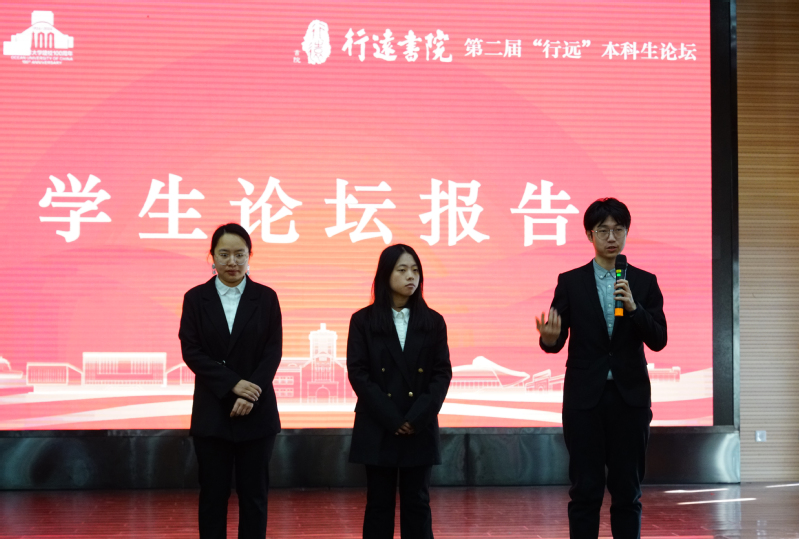 在随后进行的第一单元学生论坛报告中,行远书院八期生赵雨琛、九期生王俊懿、七期生黄莉杰分别以《文化折扣视角下曹文轩儿童文学作品海外传播的读者接受偏差研究》《论国内生命教育儿童绘本的死亡阐述》《青岛里院历史文化街区“修旧如旧”理念下场景化开发研究》为题作报告;第二单元学生论坛报告中,行远书院九期生杨佳欣、高士杰、周欣怡和陈世新分别以《数字时代下刷脸技术的法律规制——以处理数字时代的身份信息为中心》《人与AI与自我——对于人工智能的自我的探讨》《视障者与健视者的双向融合》为题作报告。九期生张新秀、七期生王旭霜以视频报告的方式分别汇报了《数智时代下网红直播带货对购买行为的影响机制——基于扎根理论的多案例研究》《绘本的语文阅读价值及教学路径探析——基于第一学段的绘本阅读教学实验》两篇论文的研究成果。在问答环节,评委老师和现场同学就报告内容与报告人进行了深入交流。