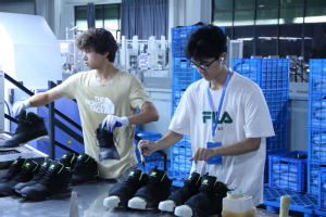 学农实践结束后,行院学子步履不停,转赴正博实业开展为期两周的学工实践。在工厂中,同学们分组进入原料仓库、布料裁断、针车拼接、冷粘成型等不同的产线岗位,与一线工人协同作业,从材料准备、部件加工到整鞋组装,切实体验了一双鞋从无到有的完整生产流程。工作之余,同学们与工厂工友以及各级管理人员面对面交流,深入了解企业发展方向、经营项目与企业文化。同时,大家将专业背景与实践观察相结合,围绕生产优化、企业文化宣传等议题,提出了许多具备可行性的方案。