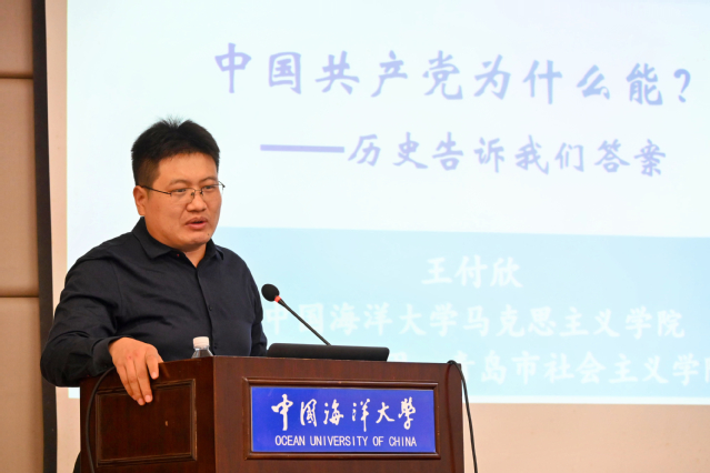 开班仪式结束后,马克思主义学院党总支副书记、副院长王付欣讲授了《中国共产党为什么能?—历史告诉我们答案》党史学习教育专题讲座。王付欣从中国共产党为什么“能”、马克思主义为什么“行”以及中国特色社会主义为什么“好”三个问题切入,从学习党史的重要性和意义讲起,讲述了中国共产党带领中华民族“站起来”、“富起来”、“强起来”的光辉历史,以及从历史中探求问题答案。他强调作为青年学生应当树立正确历史观,要不断加强党史学习,从党史中汲取不竭力量,坚定理想信念,赓续红色血脉,发扬光荣传统,发挥先锋模范作用,以史明鉴,以史明理,以史明已。