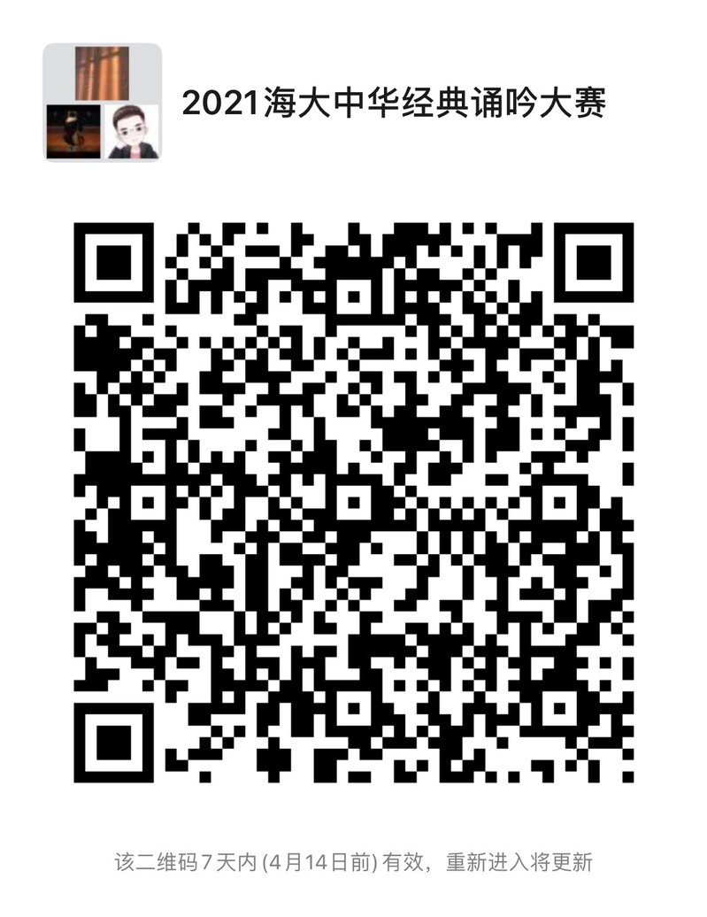请各学院广泛宣传,积极引导和鼓励本学院师生参与活动,并请活动相关人员微信扫码加入2021年海大中华经典诵吟大赛群,有效期7天,请在4月14日前加入。后期会通过本群进一步沟通活动事宜。