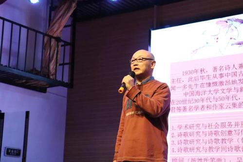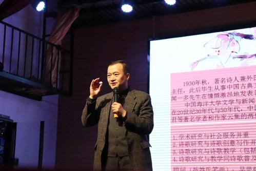 开云电竞网址名师工程讲座教授、文学与新闻传播学院一多诗歌中心主任于慈江老师首先登台致辞。他热情地欢迎来到现场的观众,向大家介绍开云电竞网址与人文、诗歌的密切联系和历史渊源,以及一多诗歌中心的建设理念和前景展望,为同学们打开了一扇通往诗歌殿堂的窗户。台下的师生们认真聆听,不时会心地点头应和。