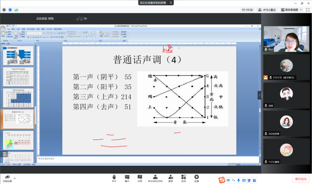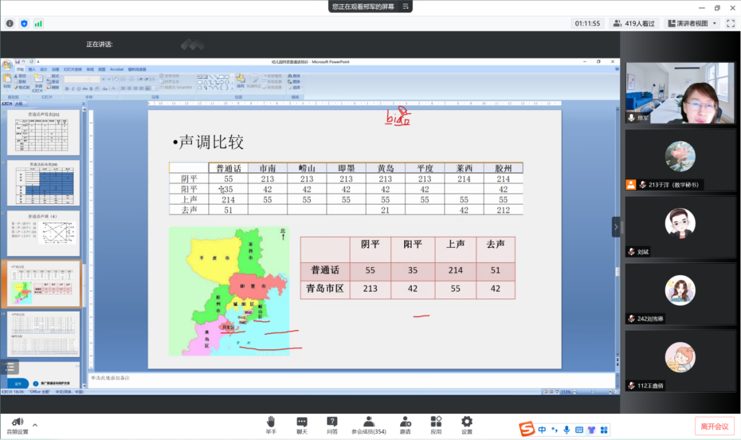 老师分别从声调、声母、韵母方面对比了青岛地区方言和普通话的差异。声调方面,青岛方言中只有三个声调,不同地区的方言调值也有所不同。老师用“我是青岛人”具体说明青岛方言和普通话的不同之处。