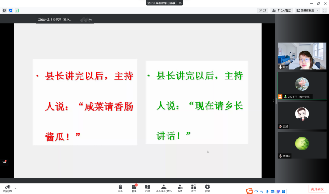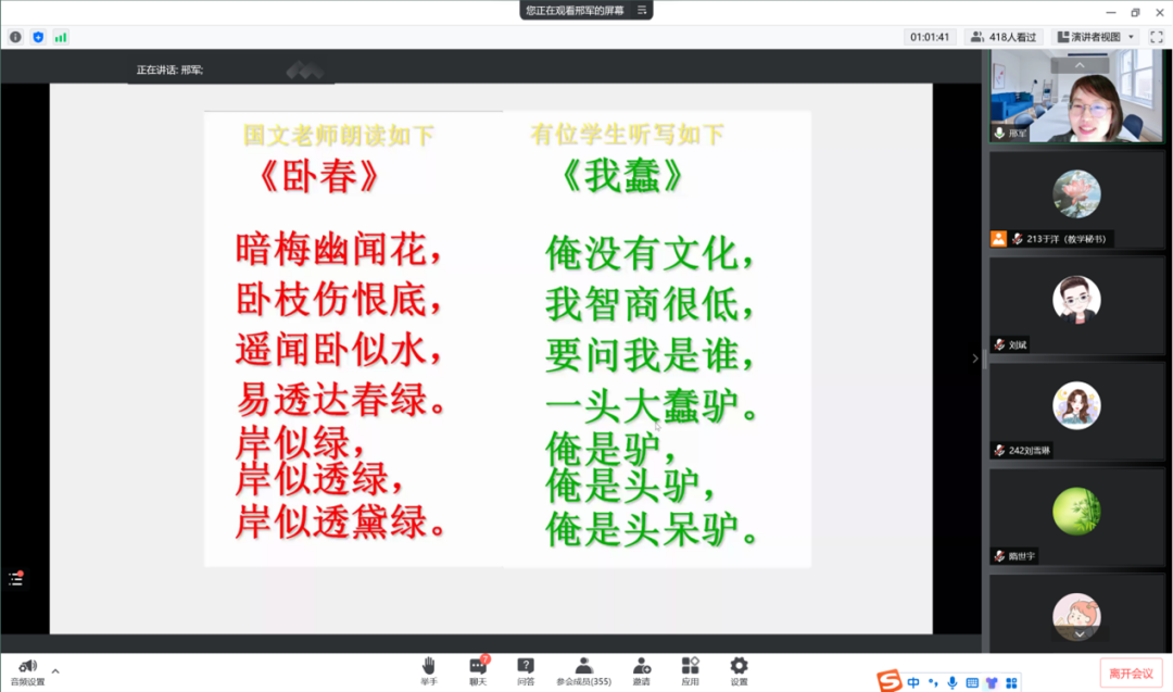 老师首先列举了“现在请乡长讲话”及诗歌《卧春》的例子,分别对比了方言和普通话在声母、韵母、声调方面的不同。方言与普通话应当从语音、词汇、语法三方面进行比较。语音主要从声韵调方面进行比较。