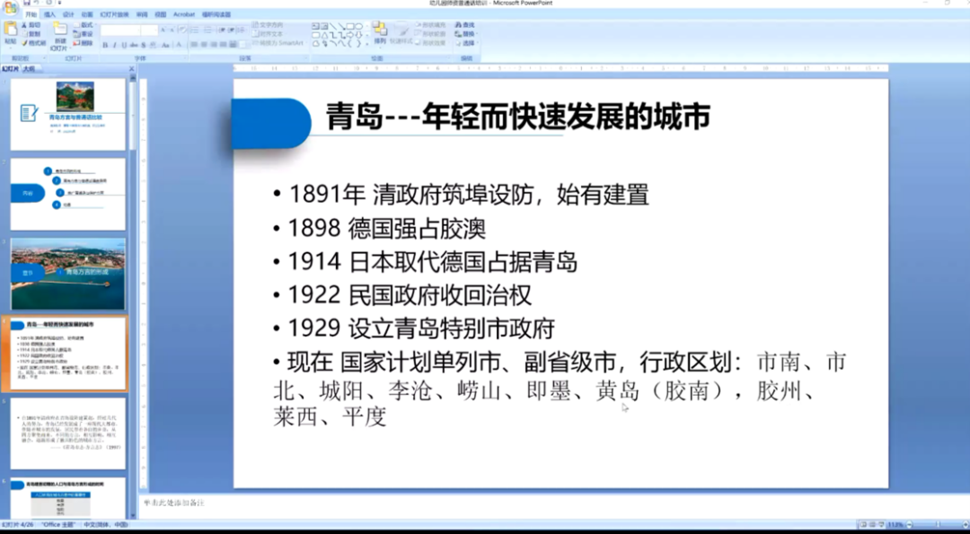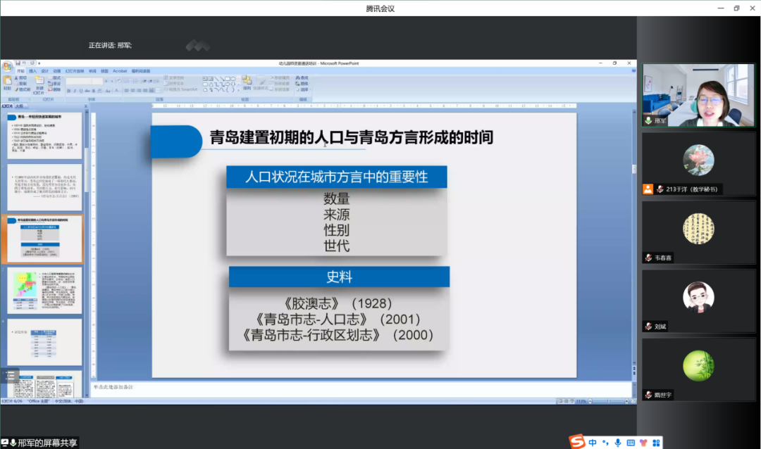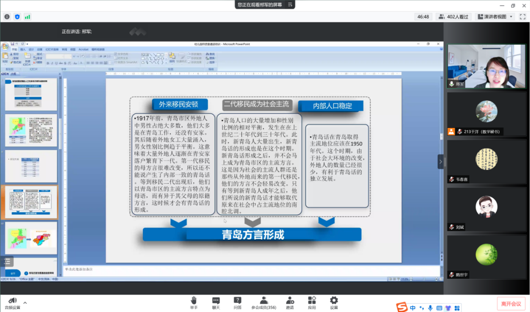 一个地区方言的发展离不开这个地区的发展,邢军老师简要介绍了青岛的发展历程并说明人口状况与青岛方言的发展的关系。