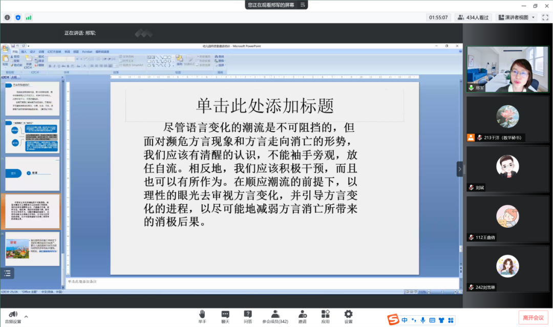 老师强调,虽然语言变化的潮流是不可阻挡的,但我们应当对方言走向消亡的形式有着清醒的认知,并进行积极的干预,在顺应潮流的前提下,引导方言变化进程的过程,让人类的语言文化生态保持应有的多样性和丰富性。