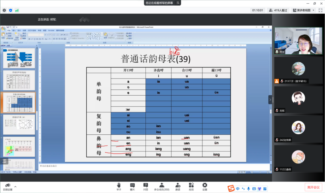老师强调,发言练习需要有听感,学员老师能够及时发觉自己在发音时口腔、舌位、嘴唇的变化,将有助于自己的练习。