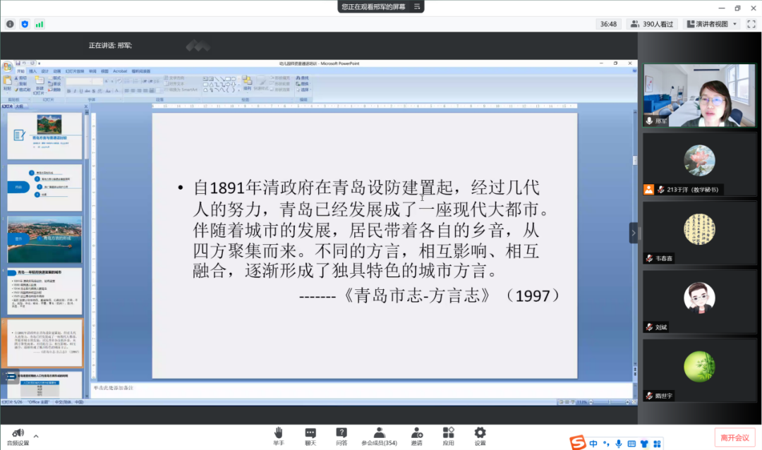 接下来邢军老师就青岛方言的形成、青岛方言与普通话语音异同、推广普通话与保护方言、结语四个方面进行讲座分享。
