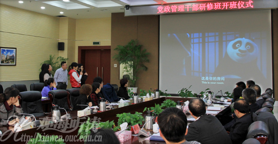 卢光志部长在开班式上指出,为贯彻落实党的十八大精神,顺应学校人才强校战略和办学国际化战略的需要,进一步加强干部队伍建设,组织部会同有关单位积极探索干部学习教育的新形式、新方法。本期研修班注重发挥学员主观能动性,以提高干部英语口语能力为重点,通过轮流主持学习研讨,定期交流读书心得,邀请学校领导、职能部门负责人和有关专家与学员进行“智慧分享”,以期在提高素质、凝聚共识、推动发展上取得成效。卢光志强调,在学校各项工作任务繁重的情况下,学员要调整好心理状态,以主人翁精神积极参与,处理好工作与学习的关系,既要严守研修班纪律,也要营造宽松活泼的学习氛围,把党的群众路线教育实践活动的要求落到实处,践行和树立良好作风,不断探索、实践和积累干部学习教育的新鲜经验。宣传部、国际合作与交流处负责同志对研修班学员分别提出了希望和要求。