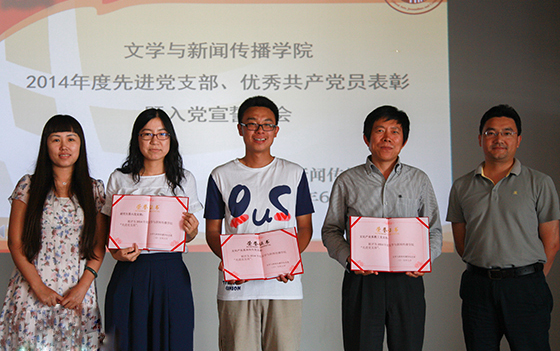 2015年6月18日下午13:00,文学与新闻传播学院先进党支部、优秀共产党员表彰暨入党宣誓大会在文学与新闻传播学院408影像观摩实验室拉开帷幕,文学与新闻传播学院修斌院长、学院党委蒋秋飚书记、席静副书记、获奖教工党员、团委全体老师及全体学生党员参加了本次活动。