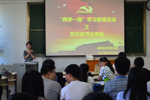 本次读书分享会为数学科学学院创新党课形式的探索,今后,学院本着提高学生党员党性修养的目的,要求每位学生党员在校期间至少一次走上党课讲台,为全院党员或者入党积极分子讲授党课,学生党员将成为党课的讲授主体。
