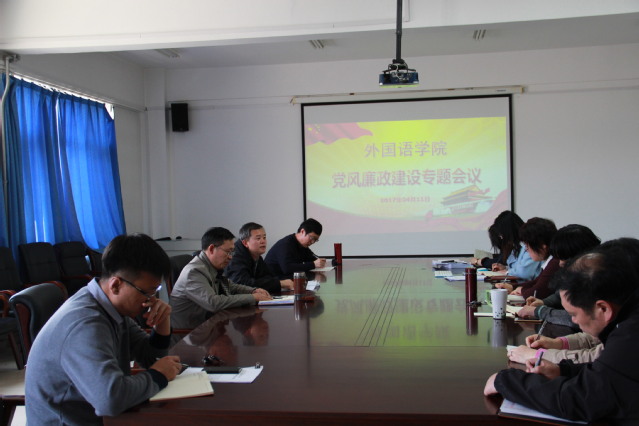 2017年4月11日下午,外国语学院在N217会议室召开了党委中心组(扩大)第二次专题学习会,本次学习会以党风廉政建设工作为主题,由外国语学院党委书记刘健主持,学院党委委员、教工各党支部书记出席了此次学习会。