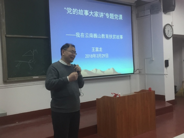 王富龙结合他在云南巍山县挂职期间的教育扶贫经历,为在场的党员和入党积极分子讲述了作为一名党员,应该如何工作、如何学习、如何自我严格要求。他从巍山县的基本情况讲起,向同学们展示了挂职巍山县副县长期间,在教育帮扶和扶贫工作上所做的工作,当同学们看到当地简陋的校舍、孩子们拥挤的宿舍、四处漏风的家时,深受触动,也深感扶贫攻坚工作的难度和重要性。王富龙用生动的故事、扎实的工作、充满感情的语言,为同学们展示了一个基层的党员干部如何全心全意为人民服务,如何为全面脱贫做出努力。同时,他也多次提到,在一年多的挂职工作中,学校和学院成为了他的坚实后盾和依靠,在学院和学校的帮助下,他从教育部争取到了对巍山的90万对口援助资金;他帮助巍山小吃走出当地,进驻海大校园;在巍山召开红雪梨产业研讨会,邀请梨产业国内领军人物为巍山的红雪梨产业出谋划策等,在学校和学院的支持下,他圆满完成了为期一年的巍山挂职任务。