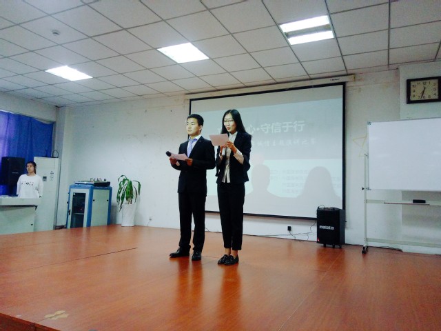 为进一步推进“两学一做”学习教育常态化制度化,加强入党积极分子的诚信意识,弘扬传统美德,6月4日晚,外国语学院在院楼N513召开“立诚于心,守信于行”主题演讲比赛,比赛由外国语学院党团委主办,本科生第一党支部、本科生第二党支部和外国语学院自强社承办。出席本次比赛的评委老师有院团委副书记贾腾飞,专职辅导员王莹,研究生德育辅导员石文秀以及2017年诚信演讲比赛冠军张钊。