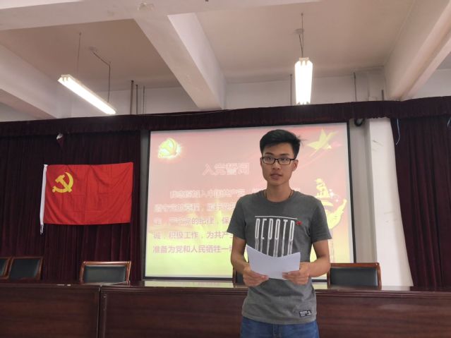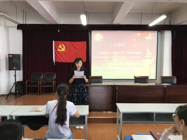 接着,大会进入第二项议程,伴随着庄严的国际歌声,老党员为预备党员们佩戴了党章,全体党员在周蕾同志的带领下,面对党旗庄严宣誓,重温了入党誓词。随后,新党员代表谷可馨同志发言,她代表全体预备党员对学院党组织的悉心栽培表达感谢,并表示一定牢记党员身份,不断提升自身思想政治修养,切实发挥共产党员的先锋模范作用,积极为文明校园建设、维护学校稳定等各项工作献计献策。