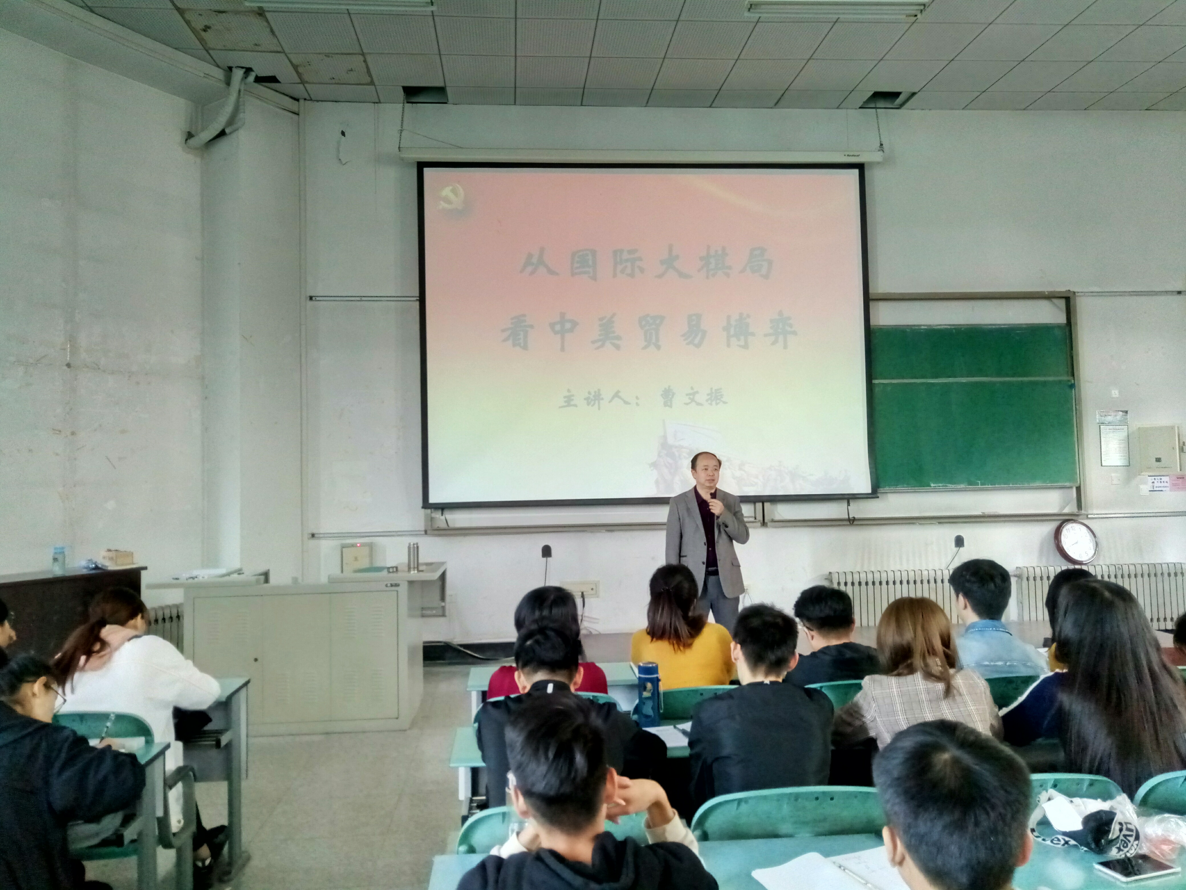 开班典礼结束后,国际事务与公共管理学院曹文振教授进行了第一次党课的授课,他以“从国际大棋局看中美贸易博弈”为主题,为同学们介绍了中美贸易摩擦的相关内容,教育同学们要了解时代,树立历史意识、全球视角、战略眼光,为海洋强国的建设贡献力量。