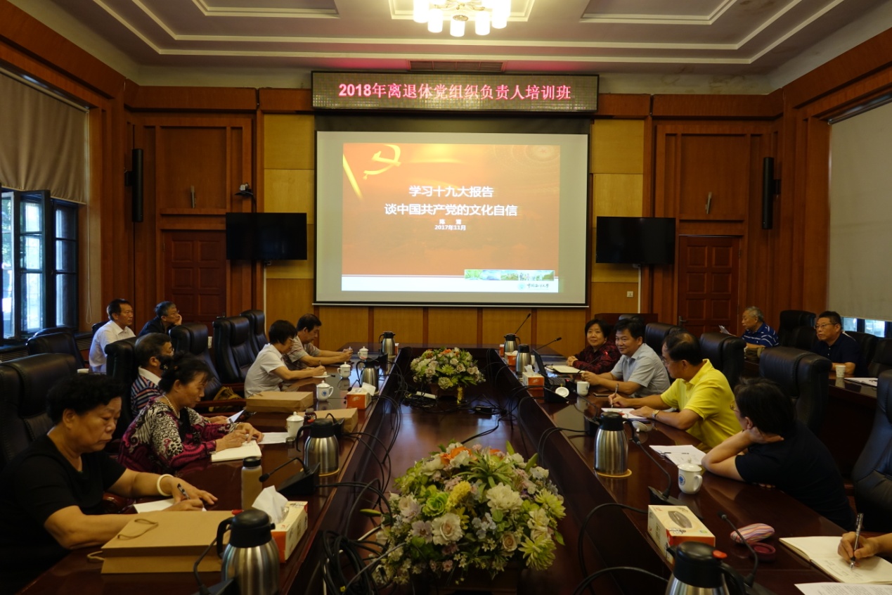 9月17日校内集体学习培训班上,邀请学校党委宣传部陈鷟部长做了题为《学习十九大报告,谈中国共产党的文化自信》的报告,他以深厚的理论功底,丰富的历史知识为学员们上了生动的一课。离退休党委书记、离退休工作处处长崔晓雁主持了培训班,并通报了下半年离退休党委的主要工作安排。离退休党委副书记、离退休工作处副处长胡保革通报了部分离退休教职工党支部调整的情况。