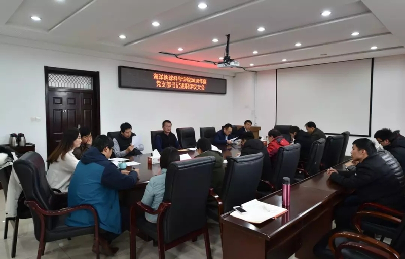 12月28日下午,海洋地球科学学院召开学院教工党支部书记述职评议会,六位教工党支部书记就2018年度的履职情况向学院党委进行了汇报。会议由学院党委书记吴军主持,学院党委委员、各教工党支部书记、党员及群众代表等参加会议。