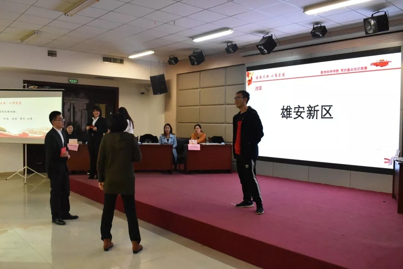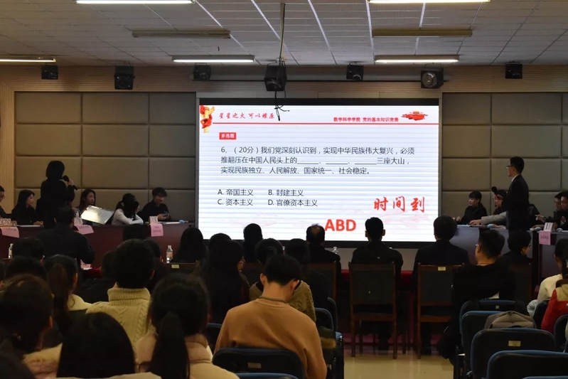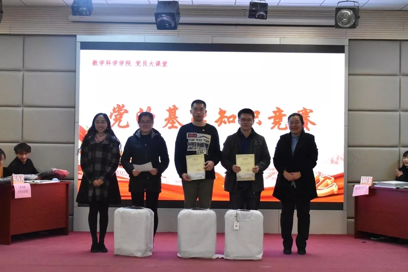 为庆祝改革开放四十周年,12月20日下午,数学科学学院第三届党的基本知识竞赛决赛在大学生活动中心二号演播厅举行。出席本次竞赛的嘉宾有党委宣传部副部长、新闻中心副主任孟凡,党委组织部秘书吴瑕,数学科学学院党委书记张丽,院长谢树森,党委副书记刘中华,副院长王卫国。本次竞赛是学院党员、积极分子共同参与的重要活动,每支队伍均由一名本科生、一名研究生、一名老师组成,旨在提升大家理论学习的热情,增强师生联谊。