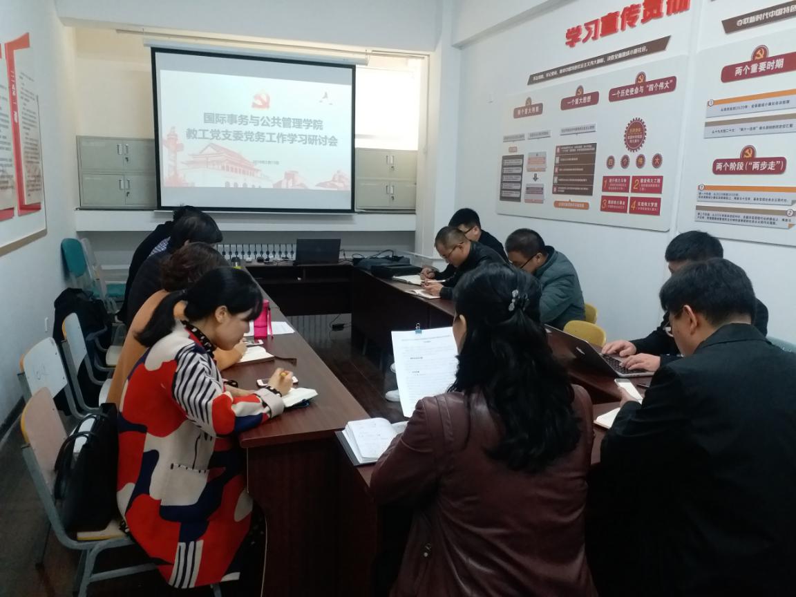 为了更好地谋划学院教职工党支部的党务工作,更好地提高基层党建工作质量,持续抓好工作落实,2019年3月14日上午,国际事务与公共管理学院在学院党员活动室召开教工党支委党务工作学习研讨会,全体教工党支部书记、委员参加会议,会议由学院党委书记庄岩同志主持。