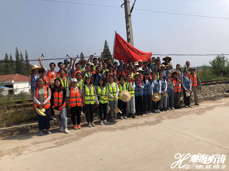 学院一行在途中遇到了正在西草埠观察岩层的师生队伍。在带队老师许国辉、刘涛、林国庆的讲解下,同学们分组认识太古界胶东群变质岩及条带状混合岩,确定桃村断裂在西草埠的出露位置。为全面了解桃村周边的特殊地形地貌,带队老师与同学们每天需头顶烈日徒步跋涉10公里。长时间的日晒使老师同学们的皮肤都明显变得黝黑,但大家精神抖擞,状态饱满,认真研讨,相互勉励,都乐在其中,学院一行的老师们深感欣慰。