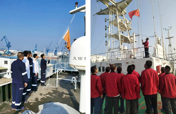 雄壮的国歌声响彻云霄,鲜艳的五星红旗高高飘扬。上午8时整,“东方红3”船、“东方红2”船以及“天使1”船分别举行隆重的升国旗仪式。各船干部职工和船员整齐列阵,面向冉冉升起的国旗庄严行注目礼,感受国旗、国歌的庄严雄壮,表达对伟大祖国的热爱与敬意。