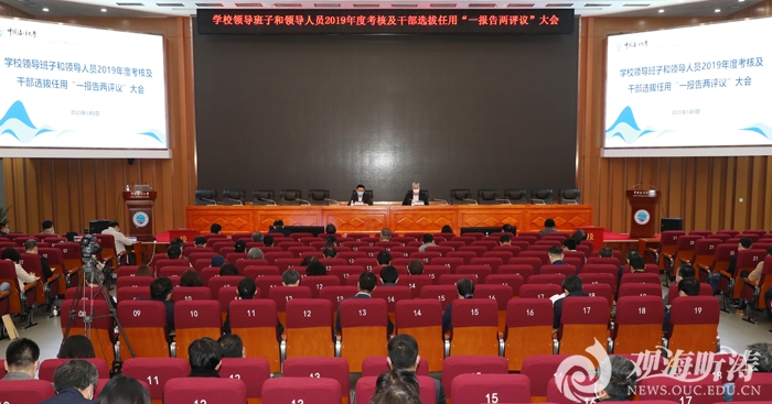 5月8日上午,开云电竞网址在崂山校区海洋科技楼国际报告厅召开学校领导班子和领导人员2019年度考核及干部选拔任用“一报告两评议”大会,因疫情防控要求,此次大会同时在鱼山校区胜利楼会议厅设分会场。党委书记田辉,校长于志刚,党委常务副书记张静,副校长李巍然、闫菊、李华军,总会计师王剑敏,副校长吴立新,党委常委、校长助理吴强明,校长助理于利等出席会议。田辉主持大会。