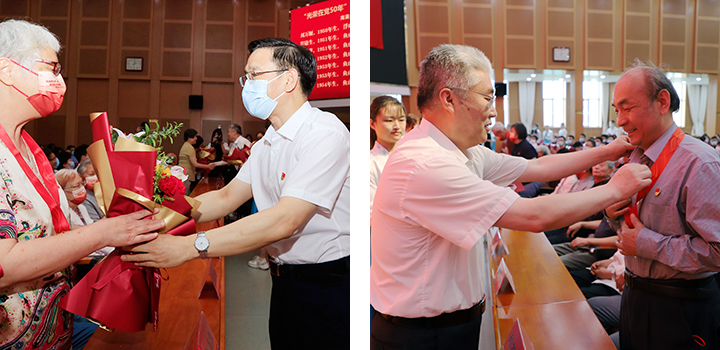田辉、于志刚代表学校党委为获得“光荣在党50年”纪念章的学校老党员代表颁发纪念章