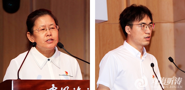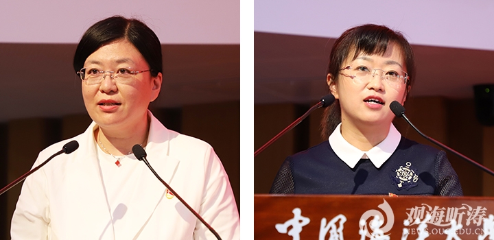 优秀党务工作者代表于静(左)、先进党支部书记代表郑慧发言