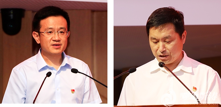 抗击新冠肺炎疫情工作先进个人代表宋青(左)、突出贡献集体代表胡京滨发言