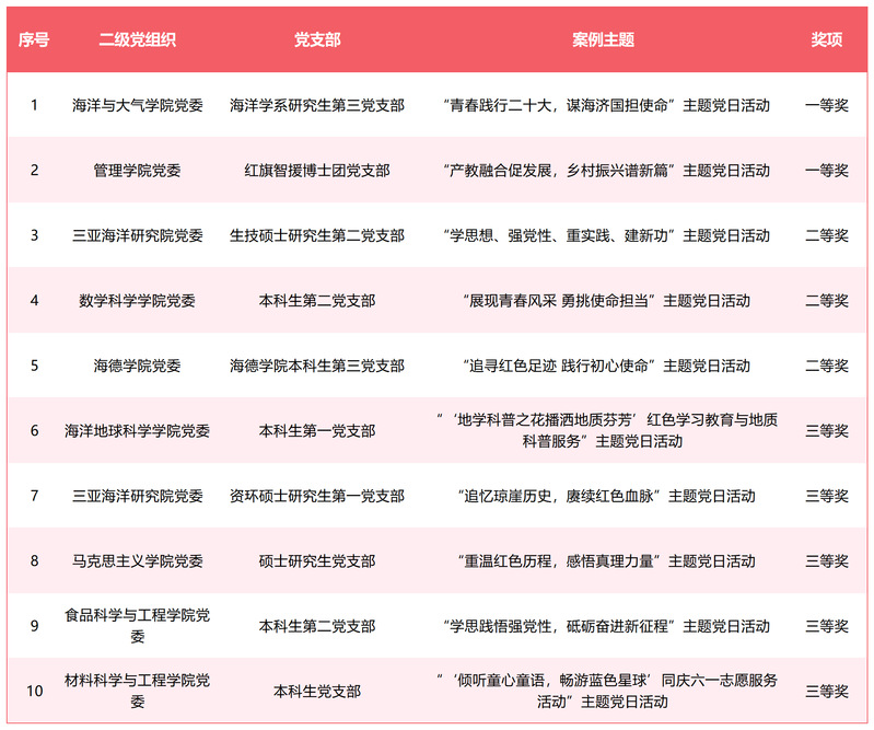 为学习贯彻习近平新时代中国特色社会主义思想,进一步加强党员队伍教育管理和严格党内组织生活,持续增强党支部的政治功能和组织功能,学校组织开展2023年优秀主题党日案例创建评选活动。经过党支部申报、二级党组织推荐,共有43幅作品参加学校评审。经过专家评审,共评选优秀主题党日案例一等奖4项、二等奖6项、三等奖10项。