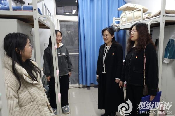 随后,许玲玲和王道平一同走访党员宿舍、2023级新生宿舍以及辅导员值班室,与学生近距离亲切交流,了解学生需求和困惑,鼓励他们利用好宿舍资源,共建文明、美丽、和谐的宿舍。